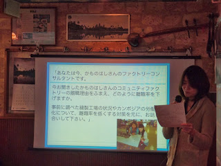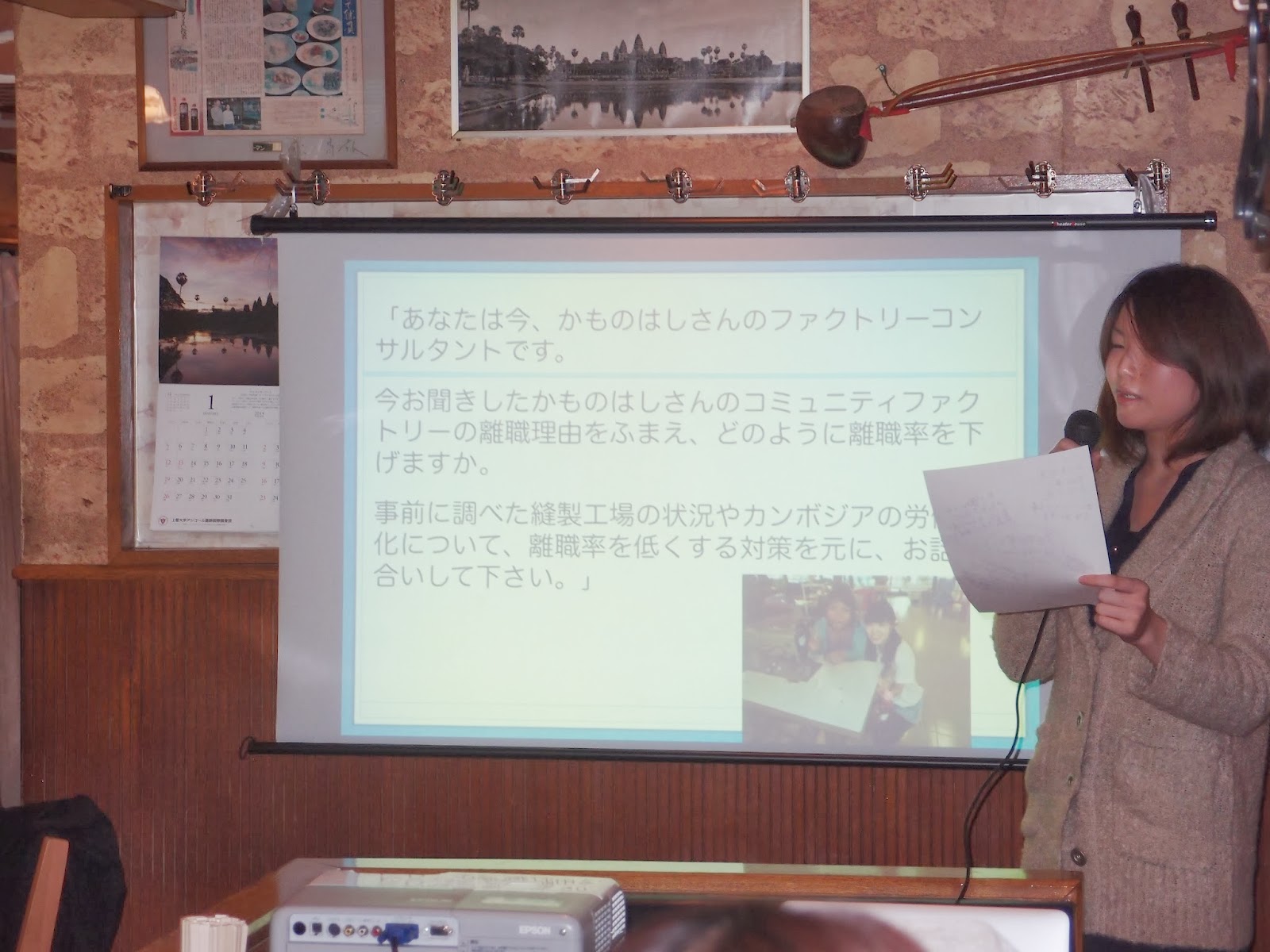 児童買春問題の深刻さがわかったこと、また、カンボジアで女性が働く際の問題(出稼ぎなと目先のことにいってしまうとか、家族の問題など)もわかり、非常に得るものが多かったです。参加者の方から面白いアイデアも出て、楽しかったです。