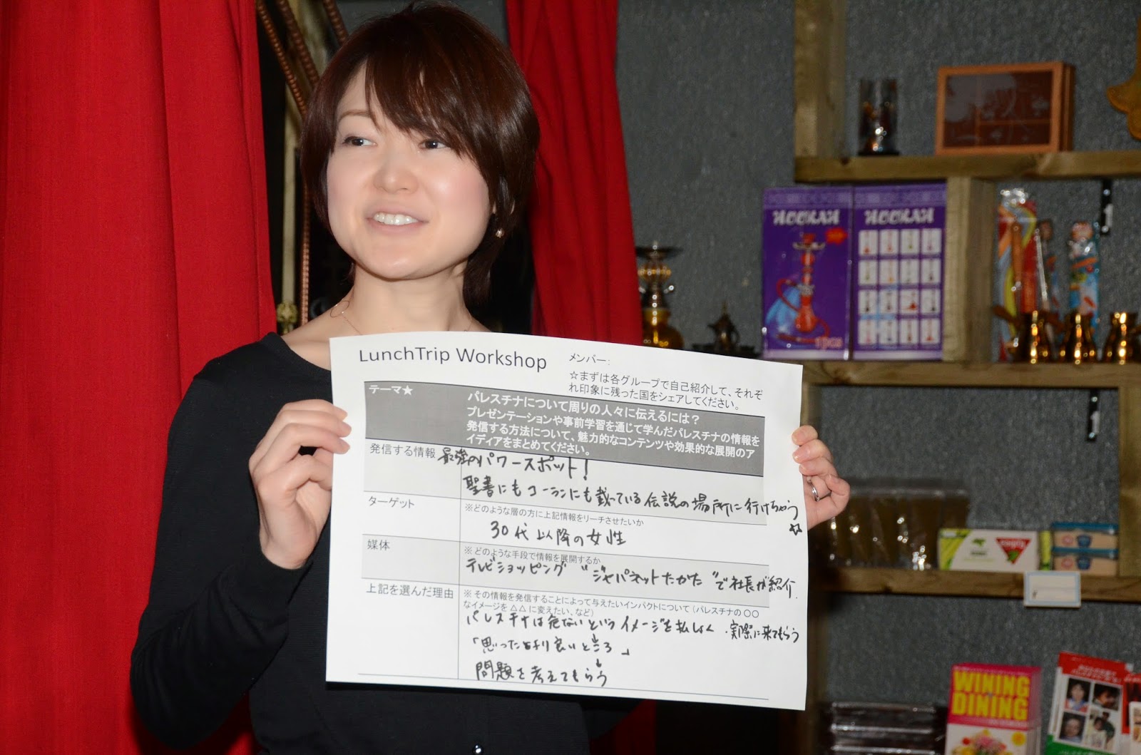 ワークショップでは、「日本の人にパレスチナを伝えるには?」というテーマで考えました。